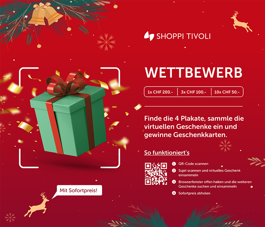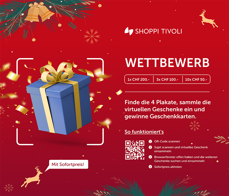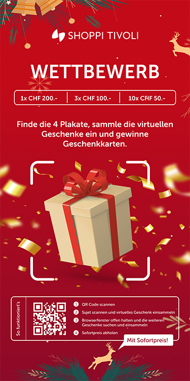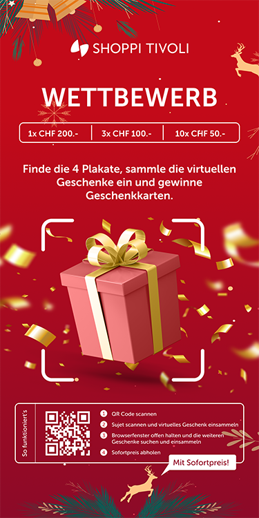 Scanne die 4 Plakate im Shoppi Tivoli und sammle die virtuellen Geschenke ein. Sobald du alle 4 Geschenke gesammelt hast, kannst du an der Verlosung teilnehmen. Viel Spass!